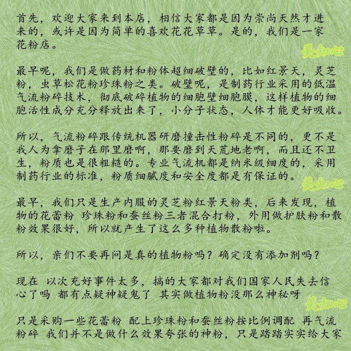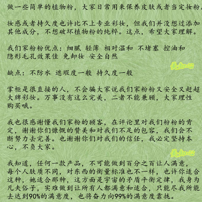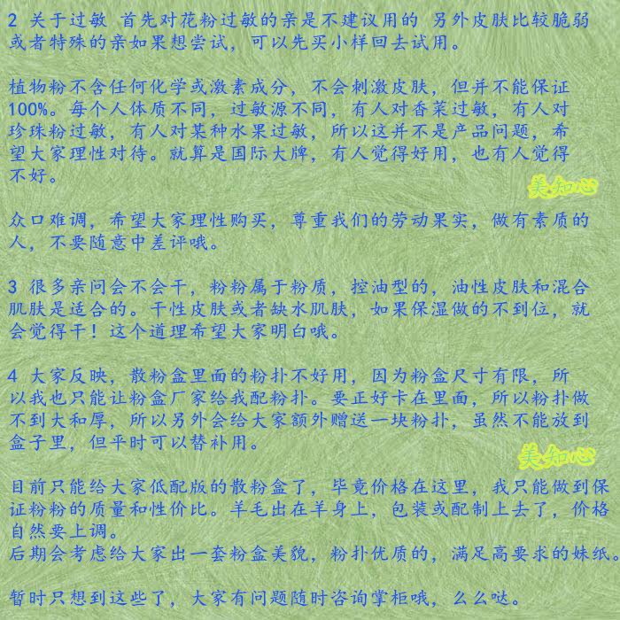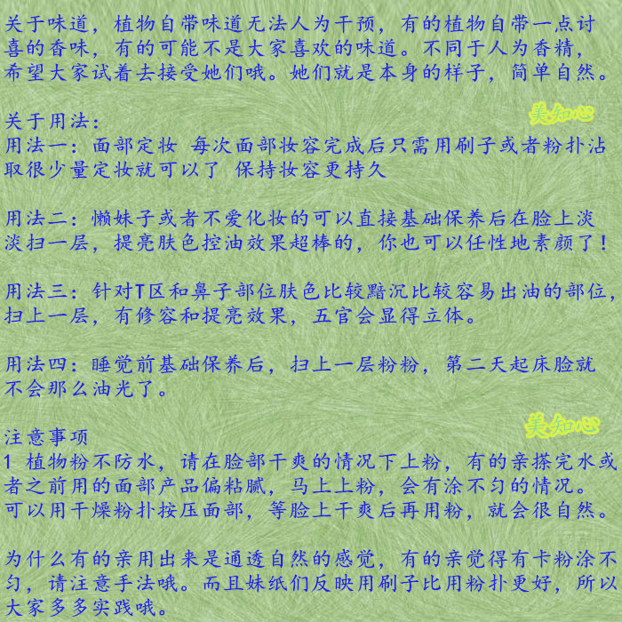 所有粉粉均为纯植物成分,不用卸妆,孕妇和敏感肌皆可用,养肤粉粉哈,MM们不用担心堵塞毛孔和烂脸。那么问题来了,它的遮瑕能力呢?纯植物的粉粉不含化学成分,自然不会厚重,所以亲们不要指望轻轻抹一层,痘痘斑点全消失哈!所以提亮肤色和轻微遮瑕是没问题的,毕竟我们是植物彩妆,养肤的同时还能适当修饰肌肤瑕疵,这才是宗旨。