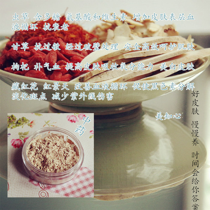 草本植物美白粉:含有名贵的药材,红景天,菌丝虫草甘草等,给皮肤最好的营养。淡淡草药味,贴近自然的味道。象牙白,美白淡斑,细腻皮肤,无论是保养皮肤还是定妆,都是不错的选择。