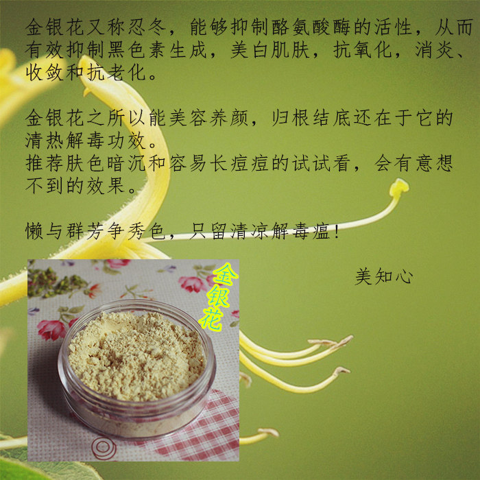 天然植物金银花粉:金银花系常用名贵药材之一,其美容、减肥和保健养生的作用更为神奇,对身体所起到的巨大保护和修复作用是十分显着的。推荐给容易上火,需要提高皮肤自净功能的MM。