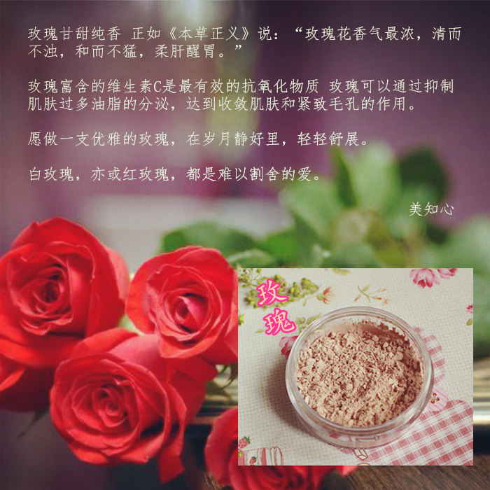 天然植物玫瑰粉:玫瑰粉粉带粉色,和桃花同色系,略香于桃花,对任何肤色都适合;对偏白的肤色更好,有白里透红的效果。很多MM误以为抹在脸上会感觉太红其实不然刚好是自然的有点粉嘟嘟的颜色非常粉嫩,美白护肤的效果都是非常好的。