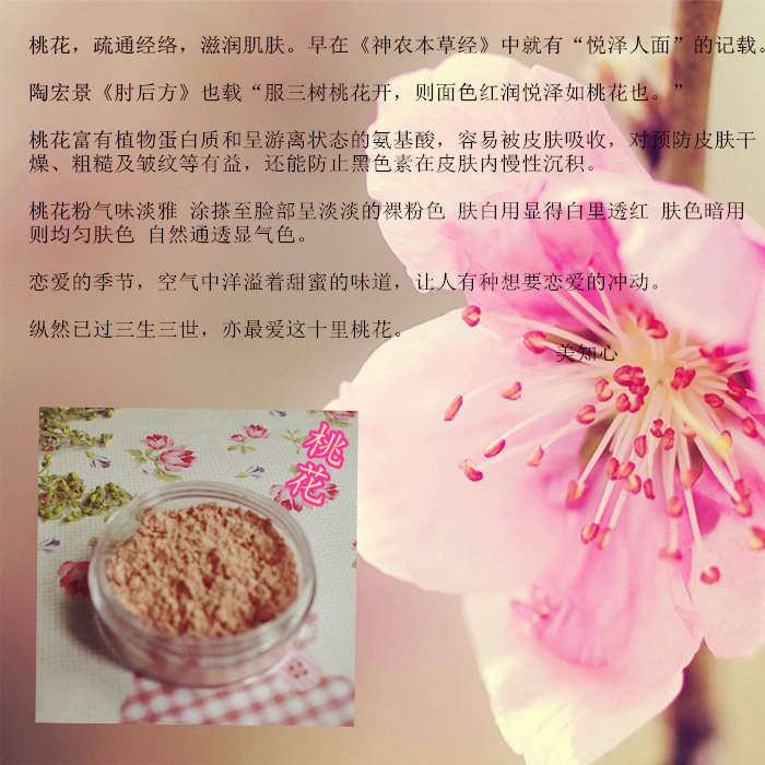天然植物桃花粉:肉粉色,颜色自然通透。美容、增白、淡化褐色素。淡淡的桃花花香气息,适合任何人,暗黄皮肤用会很自然,没有假面感,均匀肤色。白皮肤用,显气色,自带桃花玉面效果。