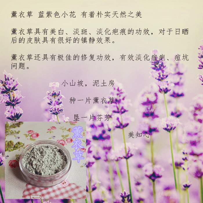 天然植物薰衣草粉:薰衣草散粉呈淡淡的蓝紫色,为薰衣草的植物本色,有淡淡的薰衣草味道,可以改善青春痘 淡化痘印 ,恢复肌肤活力弹性,同时还可以 控油 经常在电脑前工作的人群可以抗辐射和防紫外线对皮肤的伤害。