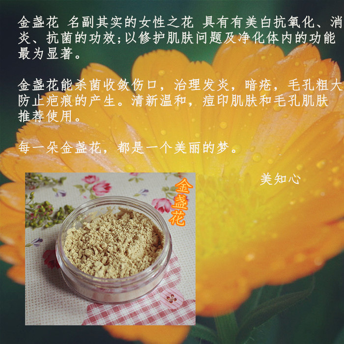 天然植物金盏花粉:金盏花具有淡化黑斑能力,添加能够深层渗透的超细珍珠粉,超细丝素粉,有效改善肌肤细胞原动力,让肌肤触感细致柔滑。
