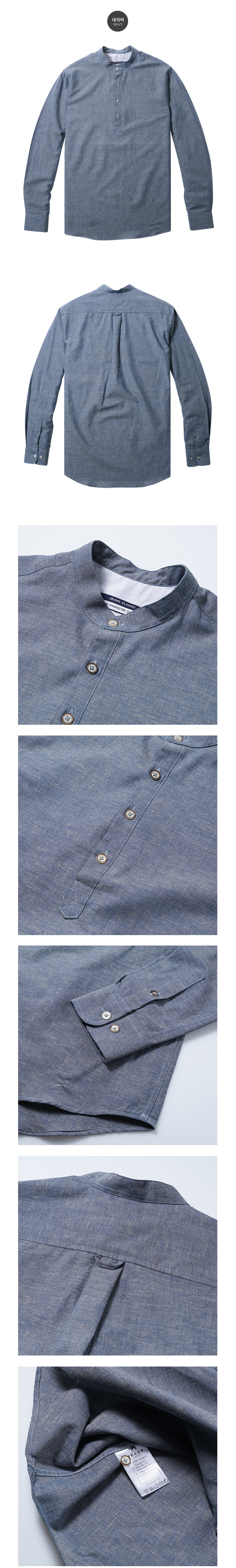 베이지틴 워싱감이 돋보이는 데님 헨리넥셔츠입니다.