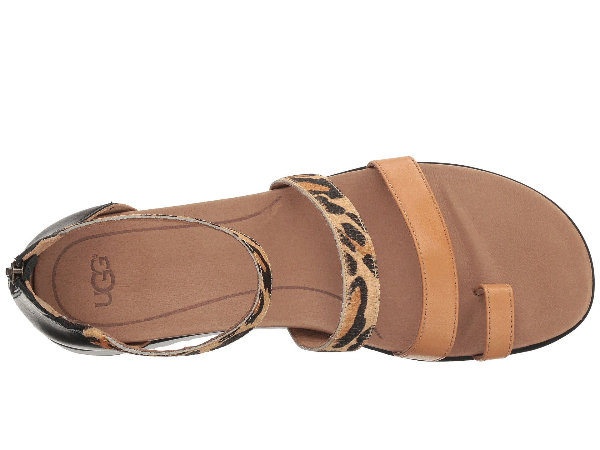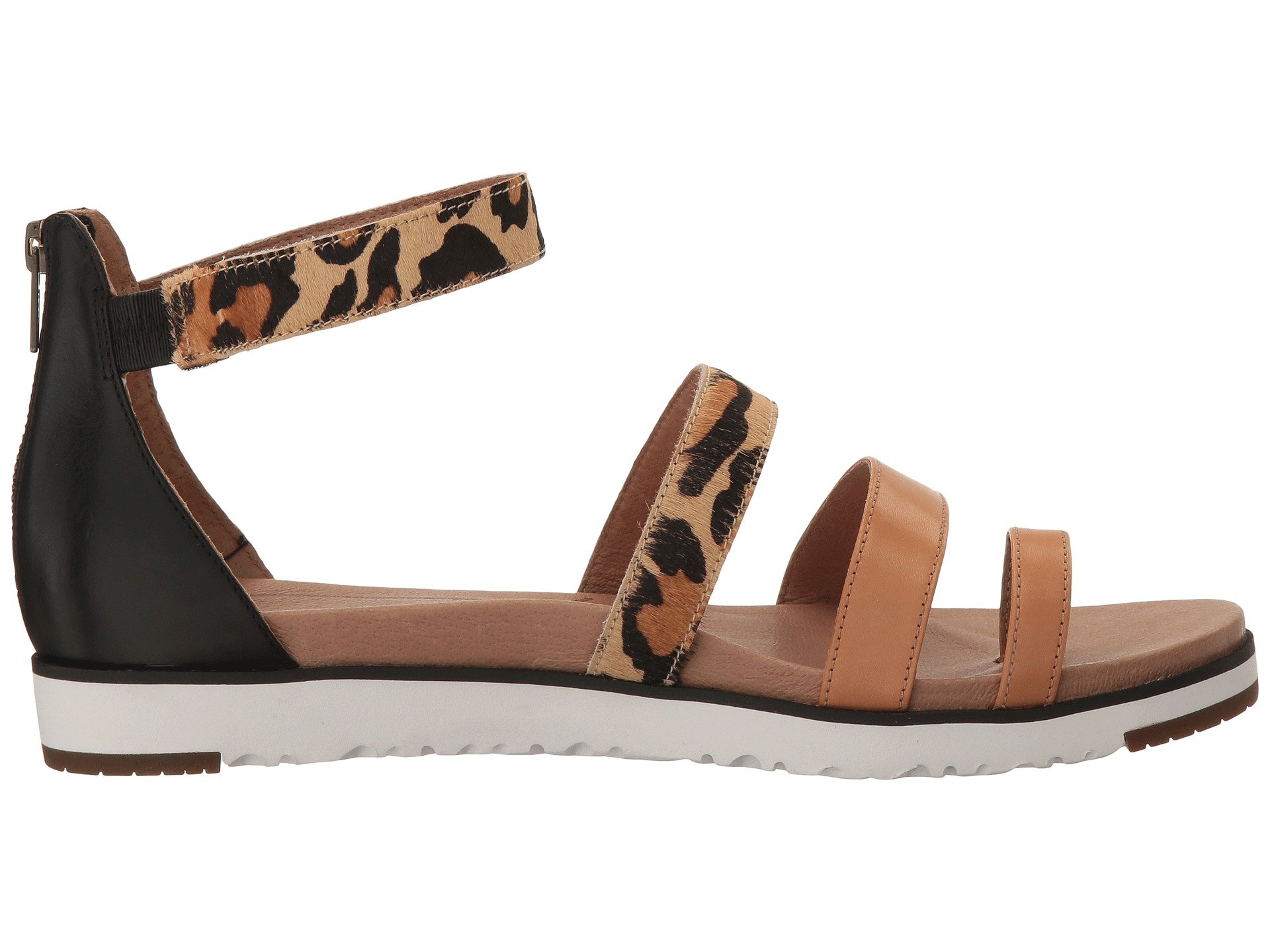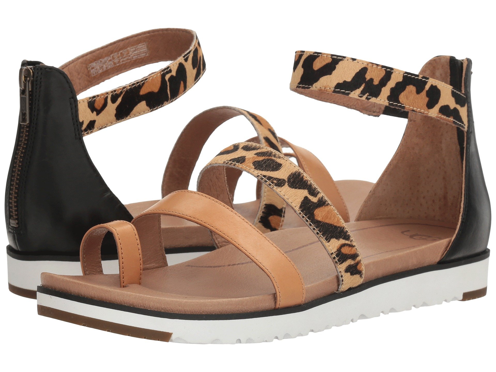 | Product Information SKU: #8808197This item is subject to quantity limitations.Make a fierce statement with the Mina Leopard sandal by UGG?.Smooth leather and leopard-print calf hair upper.Leather lining.Imprint by UGG™ insole.Rubber toe and heel.Treadlite by UGG™ outsole provides increased traction, durability, cushioning and flexibility.This product contains real fur from Sheep, Lamb, or Cow. Fur Origin: Australia, UK, Ireland or United States. Real Fur has been artificially dyed and treated.Imported.Product measurements were taken using size 7, width B - Medium. Please note that measurements may vary by size.Weight of footwear is based on a single item, not a pair.Measurements: Heel Height: 1 1?2 in Weight: 7 oz |