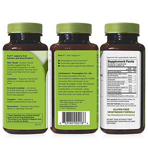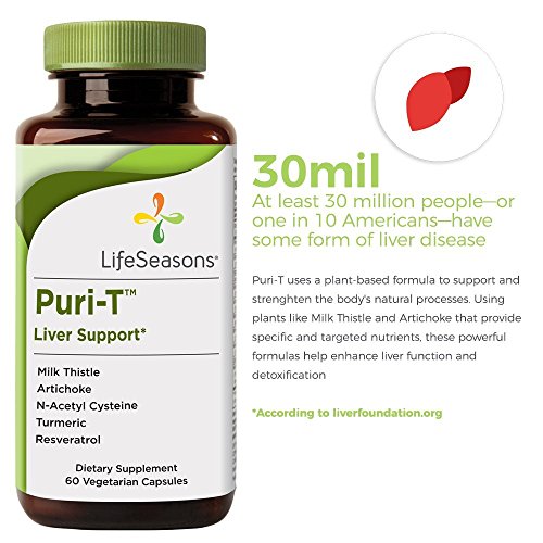 -. Feature : NATURALLY ENHANCE LIVER FUNCTION: Puri-T enhances liver function and detoxification. This liver support supplement works to help the body naturally fight the damaging effects of free radicals and supports healthy bile flow. It helps your body feel better. / PREVENTATIVE SUPPORT: Help your liver do its job eliminating toxins more efficiently. People who take Puri-T are not likely to experience a dramatic difference in the way they feel. This product is meant to be preventative, helping the liver do its job to eliminate toxins more efficiently. However, most people will subtly just feel better after taking Puri-T for several weeks. What a lot of people notice is that they feel a lot worse when they DO NOT take Puri-T. / CLINICALLY-TESTED INGREDIENTS: Our Puri-T formula is designed to enhance liver function by using ingredients like Artichoke Leaf, Milk Thistle, Resveratrol and Turmeric that can help detox the liver. / HELP DETOX YOUR LIVER:Take two capsules every morning with or without food. You may also take two capsules prior to drinking to help avoid a hangover the next day. For added benefits, take one minute to sit down, take three deep belly breaths, and imagine your liver feeling protected and strong. / NATURE WORKS. SCIENCE PROVES IT: LifeSeasons creates supplements to support your body's health. Our expertise is at the heart of every formula that we create as we balance the wisdom of nature and the progress of science through natural health supplements.