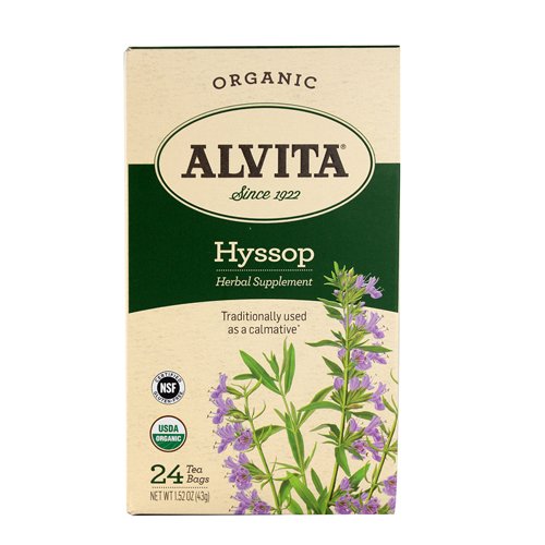-. Binding : Health and Beauty -. Brand : Alvita -. EAN : 0027434040280 -. Feature : A member of the mint family, hyssop (Hyssopus officinalis ) is known for its unique flavor, cleansing strength and distinctive aroma / The name hyssop is of Greek origin taken from the word "azob" which translates to "holy herb / For centuries, herbalists have esteemed this herb for a broad array of beneficial uses, including brewing the leaves and flowers as a tea to use as a calmative -. IsAdultProduct : 0 -. Label : Alvita -. LegalDisclaimer : Actual product packaging and materials may contain more and different information than what is shown on our website. We recommend that you do not rely solely on the information presented and that you always read labels, warnings, and directions before using or consuming a product. Please see our full disclaimer below. -. Manufacturer : Alvita -. MPN : 1536879 -. NumberOfItems : 1 -. PackageQuantity : 1 -. PartNumber : 1536879 -. ProductGroup : Health and Beauty -. ProductTypeName : HEALTH_PERSONAL_CARE -. PublicationDate : 2014-12-22 -. Publisher : Alvita -. ReleaseDate : 2014-12-19 -. Size : 24 -. Studio : Alvita -. Title : Alvita Organic Hyssop Herbal Tea, 24 Count -. UPC : 027434040280