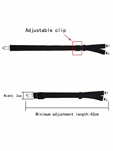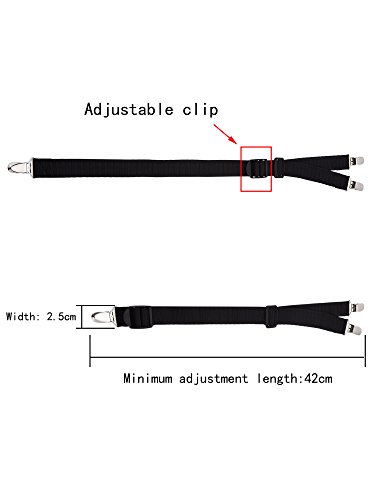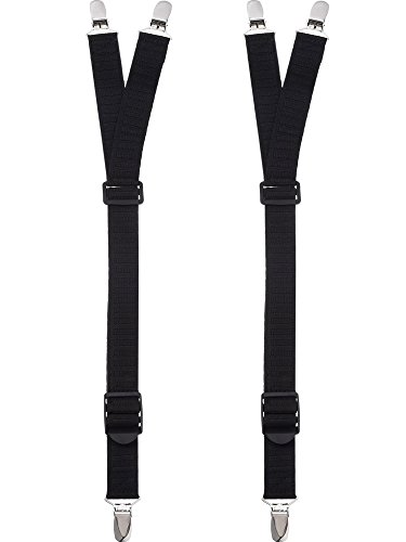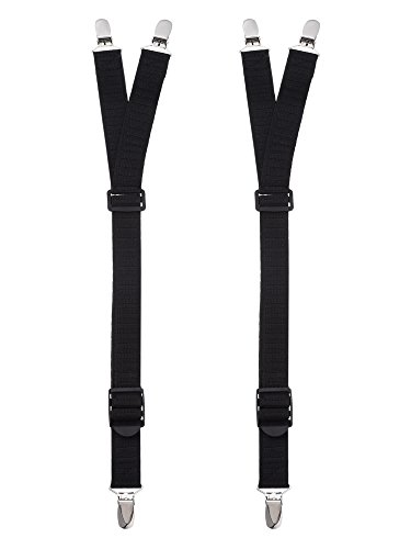 Mtlee 1 Pair of elastic shirt stays garter straps sock suspenders for men Features: Y-style: The Y style sock suspenders includes 2 stays with 1 clip connecting to your sock and with 2 clips on your shirt. Strong clasps: Strong metal clasps with plastic grips keep a tight hold on your clothes without damaging them. Adjustable length: Unstretched length: 16.5 - 23 inches; Fully stretched length (max): approx. 39 inches; Designed to fit men and women br> Function and application: Keep your shirt tucked and socks stay in place, maintain your professional look all day long; Suitable for people looking to keep their shirt tucked in around the office or during formal nights, like police, businessman, bridegrooms, lawyers, etc. Color: black Package includes: 1 Pair of shirt stays 0