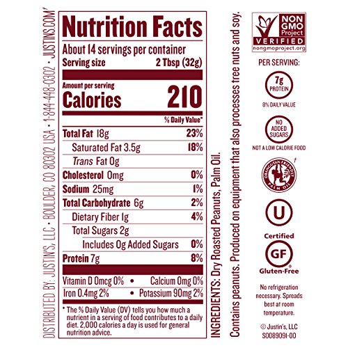 ReleaseDate : 2014-02-17 Studio : Justin's Publisher : Justin's Binding : Grocery Product Description All Justin's Nut Butters are made in small batches to preserve premium quality standards and fresh taste, using the highest quality natural and organic ingredients that are sustainably harvested and found as locally as possible. Our small batch grinding process means that every batch will have a unique and slightly different taste from the last. The mission at Justin’s is making the foods we love extraordinary, with an uncompromised spirit of innovation, sustainability and community. Our products are made with common sense. A sense that cooking in small batches ensures higher quality. That selectively choosing fine, all-natural ingredients will make it taste better. And that no matter their size, companies should always be grateful to their customers, employees and community. 0