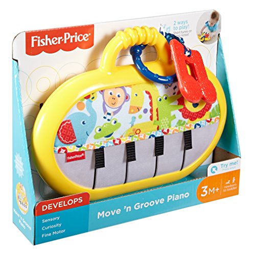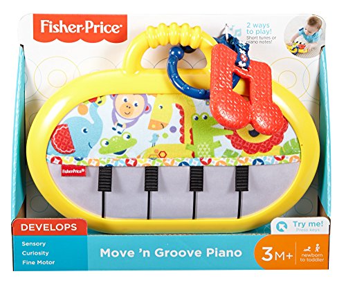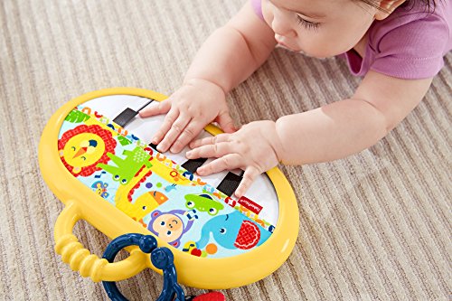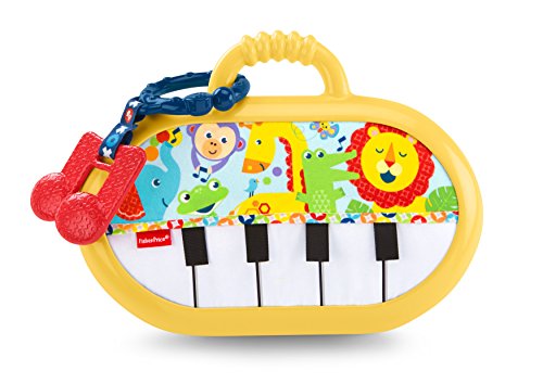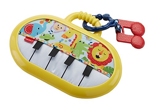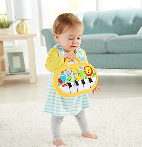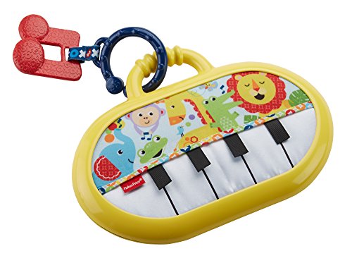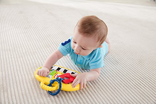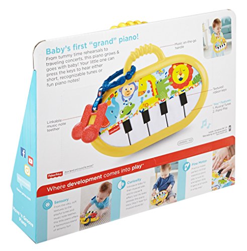 From tummy time rehearsals to traveling concerts, this toy piano grows and goes with baby! Your mini Mozart can press the keys to hear either short, recognizable tunes or real piano notes. The soft keyboard with electronic white keys and textured black ribbon keys invites even the youngest pianists to feel, touch and play. And, (fanfare please!) there's even a linkable musical note tether to chew on and a handle to take this show on the road! Where development comes into play Sensory - From the silky, soft textures to the playful tunes and music note tether, this little piano offers a harmonious blend of sensory fun! Curiosity and Discovery - Introduce baby to their musical side, and to cause and effect, too! As little ones press the piano keys, they'll hear fun musical rewards. Fine Motor - Practice makes perfect! All that repetitive piano play can help strengthen little fingers and hands in a big way.Feature