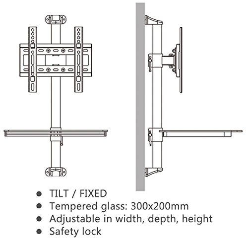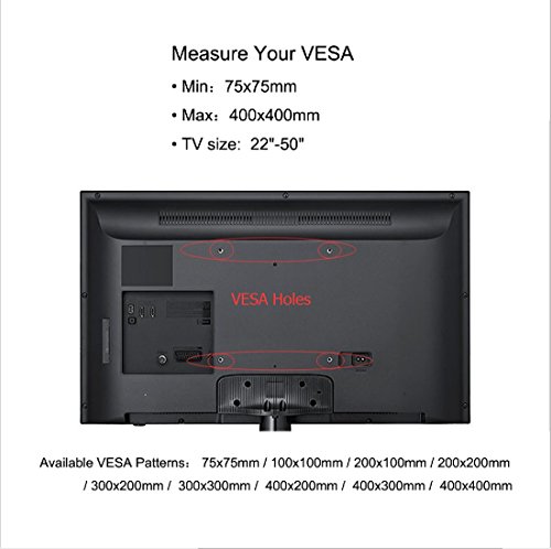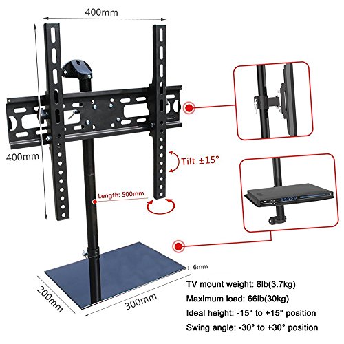 -. Feature : TV Mount Max Supported Size 22 to 50 Inches VESA Compliant TVs -- Wall TV mount load capacity up to 66pound Flat Panel LED, LCD TV. Tilt Television mounts features VESA compliant, tilt, swivel, adjustable, low profile, heavy duty, providing easy viewing from any seat in a room / Mounting Hole Pattern, Min: 75X75mm, Max: 400X400mm -- Please check that your monitor is VESA (Video Electronics Standards Association) compliant which back features a standard hole pattern used for mounting purposes / Tilting mounts provide angle adjustment up or down (-15° to +15° position), left or right (-30° to +30° position) to find the perfect view. The ideal TV height is centered at eye level, which averages 42" when seated / Built-in Safety lock keeps your flat panel TV safe and stable -- Easy Tilt TV mount was very popular design which made the consumers can install their TV at home by themselves in fast time. Super low profile design saves the room space and makes your TV looks like a picture hanging on the wall / Modern decorative plate and glass shelf (11.8 inch Wide, 7.9 inch Length) is designed to hold DVD players, DVRs, HD recorders, Cable TV Boxes, AV components, gaming systems, for storage of CDs, DVDs and any other media
