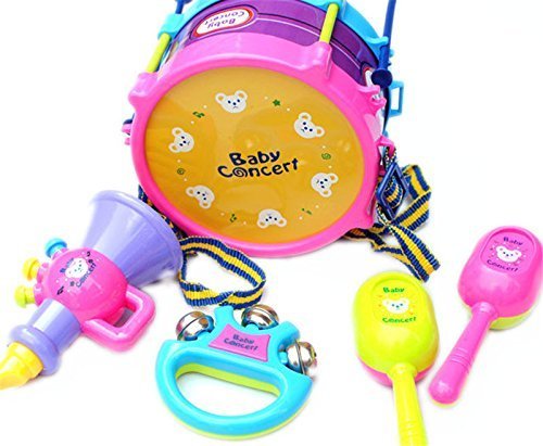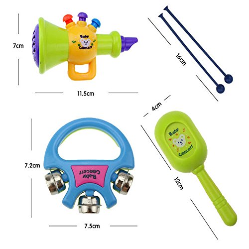 Do you want a toy that can be both fun and educational for your baby? Well then you need to take a look at the Novelty fun Toy Drum Set. This Circus Music Set is a fun and colorful addition to any baby's play time. This set is the perfect way to introduce music and instruments to your child or just a way to relax and have some fun. This Circus Music Set contains all you need to start busting a tune just like your favorite band What are you waiting for! Size : (approx) Drum : 8cm/3.15''x 12cm/4.72''(HxD) trumpet:11cm/4.33''(L) Cabasa:11.5cm/4.52''(L) Handbell:7cm/2.75''x7cm2.75''(LxH) Package Included 1x Drum with drum sticks 1x Trumpet 2x Cabasa 1x HandbellFeature