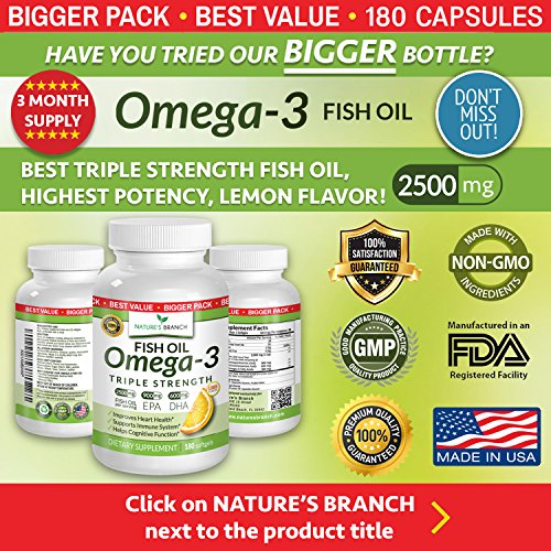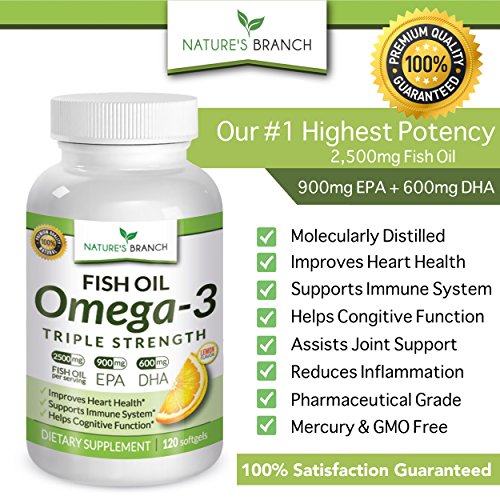 If so, Nature's Branch Omega 3 Fish Oil is your best choice delivering 2,500mg of fish oil in every serving! While cheaper Omega 3 supplements provide small amounts of health promoting fatty acids, our Omega 3 Fish Oil delivers 1,640mg essential fatty acids per serving with 860mg EPA and 650mg DHA, perfect for cardiovascular health, joint support, eyes, brain and nerve function + many more bodily systems!