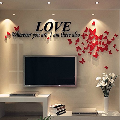 Ammybeddings Stereo Acrylic Crystal Wall Decal,Art Home Decoration,3D Wall Decal, Love Quotes and Red Butterfly,150*56 CM (Red-11068950)