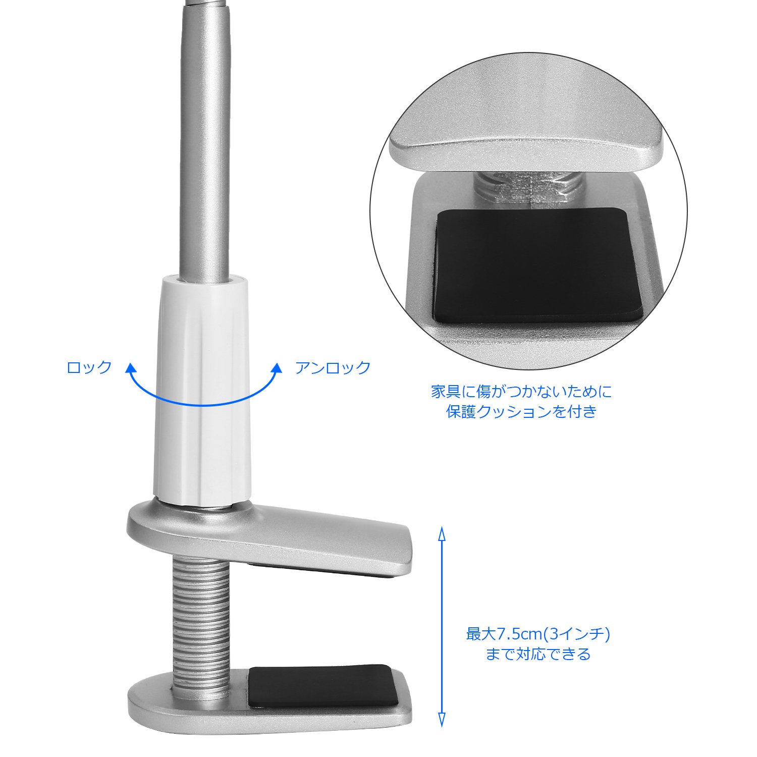 A clamp type that can be attached to a table up to 2.1 inches such as a table or a desk.