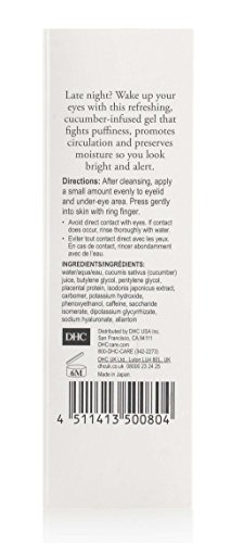 DHC eye bright depuffing gel instantly helps minimize problematic under-eye bags and fights dryness and dark circles with caffeine. This fast-absorbing, calming cucumber-infused gel is lightweight and soothing. It’s a difference you can see in a blink.Feature