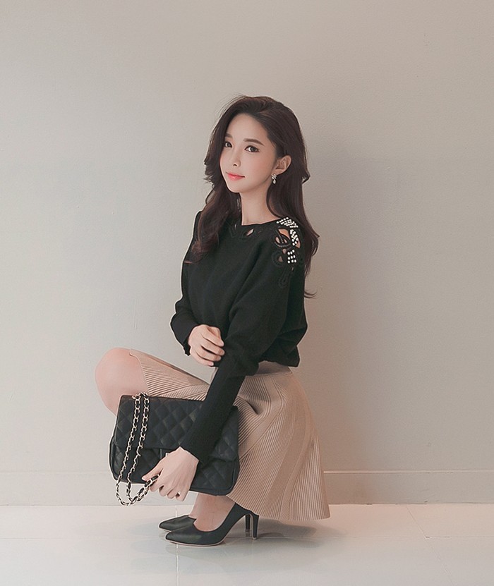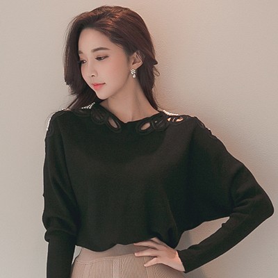 商品名:ニット トップス ドルマン 長袖 レース配色 ビジュー