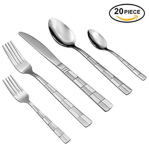 20-piece flatware set with service for 4. Set includes 4 each: place knife, place fork, place spoon, salad/dessert fork, and teaspoon