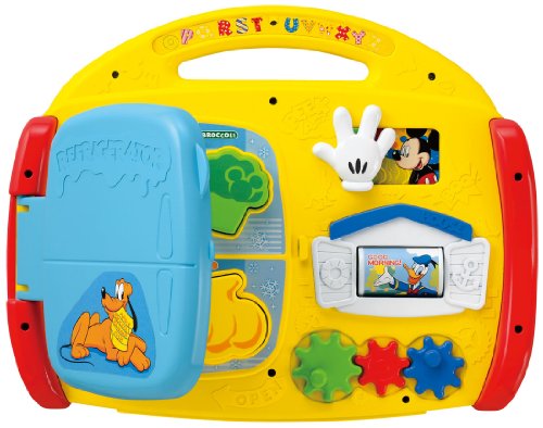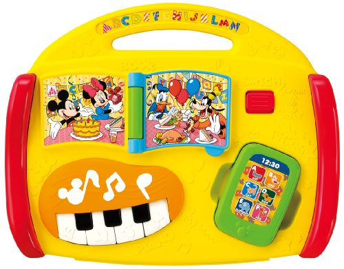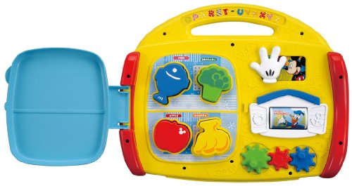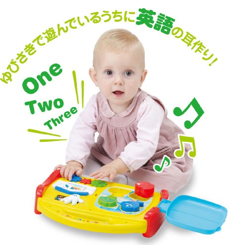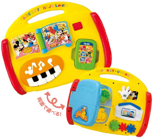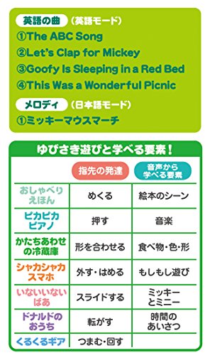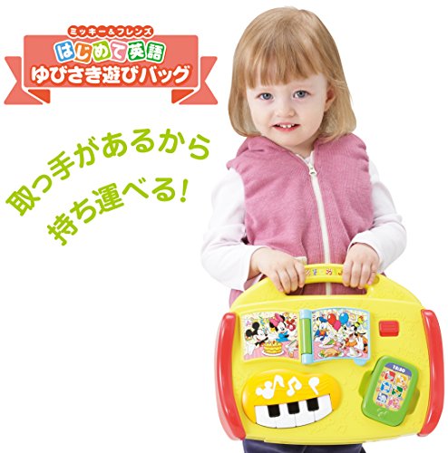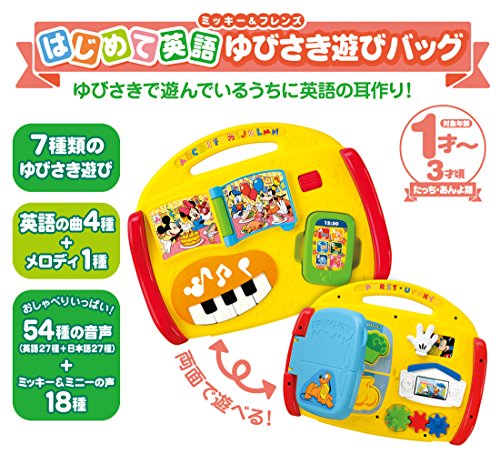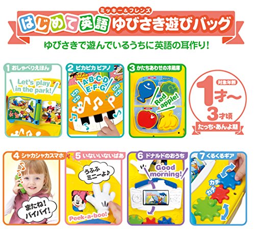 バッグ型の英語の音声や音楽が入ったベビ-トイです。楽しくおもちゃで遊びながら、自然に英語の音声に慣れ、手や指先の発達も促進します。また、月齢が高くなってきたら、お子様自身が持ち運ぶのを楽しむことができます。「全部で7つのゆびさき遊び」1・えほん、2・ピアノ、3・スマートフォン、4・れいぞうこ、5・いないいないばあ、6・ドナルドのおうち、7・歯車、音声、54種(英語27種+日本語27種)+ミッキー&ミニーの音声18種・メロディ5種(ワールド・ファミリー英語の曲4種+ミッキーマウスマーチメロディ1種。