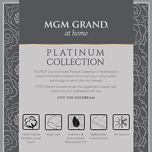 -. Brand : MGM GRAND at Home -. Feature : Soft cover of 100% cotton / 5-in. thick top of polyester puffball fill and grey duck feathers / Offered in standard sizes / Stretchy polyester elastic fits over beds up to 18 in. high / Baffle-box stitching with feather proof interior liner / Suave funda de 100% algodón. / 5-in. gruesa de poliéster superior Puffball llenar y plumas de pato gris / Disponible en tamaños estándar / Elástico poliéster elástico se adapta a camas de hasta 18 cm de alto / baffle-box costuras con interior de prueba de plumas de maletero -. ProductGroup : Home -. ProductTypeName : HOME_BED_AND_BATH -. Title : Platinum 5 in. Featherbed Mattress Topper by MGM GRAND at Home