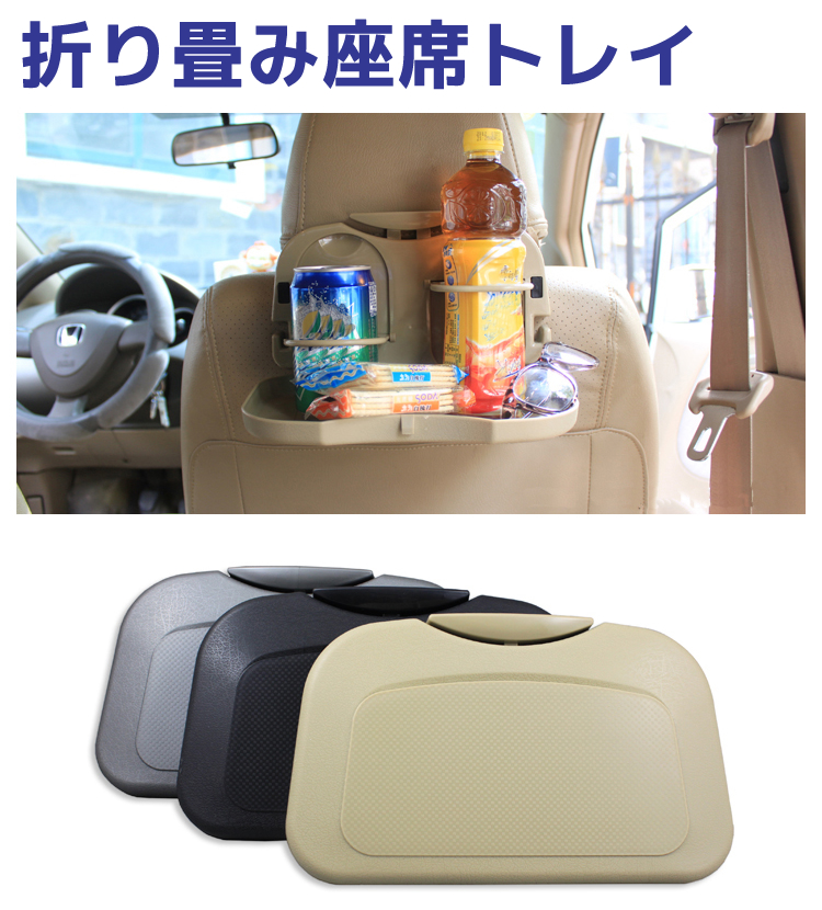 前座席のヘッドレストに簡単に取り付けができ、使いたいときに開くだけでドリンクホルダーとお菓子などが置けるトレイです。