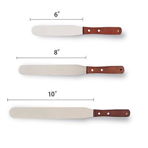 Buying this 3 pc angled icing spatula set: ?Sturdy blade allows to cut cakes and curds. ?It is easier to put icing on your homemade cakes. ?Comfortable wooden handle that doesn't tire your grip. ?The consistency is fine for piping small outlines details. ?The blade sizes are six, eight, ten inches with a wooden handle. It is a great size range to make cupcakes as well as larger cakes.