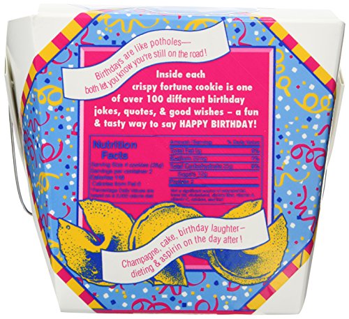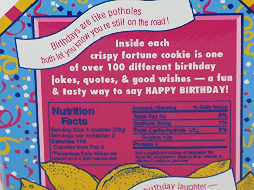 -. Binding : Misc. -. Brand : Sensational Sweets -. EAN : 0079881044533 -. Feature : GIVE A BIRTHDAY FORTUNE as well as a unique birthday gift with delicious fortune cookies. / A YUMMY TREAT! Each cookie is crunchy, slightly sweet, individually wrapped and Kosher certified. / UNIQUE BOX! Conveniently packaged in a wire handled take out box with 8 cookies inside. / A TASTY WAY TO SAY HAPPY BIRTHDAY! Inside each cookie is one of over 100 different jokes, quotes and good birthday wishes, for all ages. / FOR EVERYONE! Wonderful gift for people of all ages and includes a name tag on the top of each box. Also great to use for decorations or serve at your next social gathering. -. IsAdultProduct : 0 -. Label : Sensational Sweets -. Manufacturer : Sensational Sweets -. MPN : FCBD -. PackageQuantity : 1 -. PartNumber : FCBD -. ProductGroup : Grocery -. ProductTypeName : GROCERY -. Publisher : Sensational Sweets -. Studio : Sensational Sweets -. Title : Happy Birthday Fortune Cookies – Unique Gourmet Gift - Kosher Certified -. UPC : 079881044533