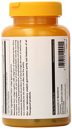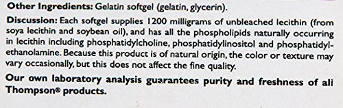 ReleaseDate : 2015-06-22 Studio : Thompson Publisher : Thompson Binding : Health and Beauty Product Description Each softgel supplies 1200 milligrams of unbleached lecithin (from Soya Lecithin and Soybean Oil), and has all the phospholipids naturally occurring in Lecithin including phosphatidylcholine, phosphatidylinositol and phosphatidylethanolamine. Because this product is of natural origin, the color or texture may vary occasionally, but this does not affect the fine quality. 0