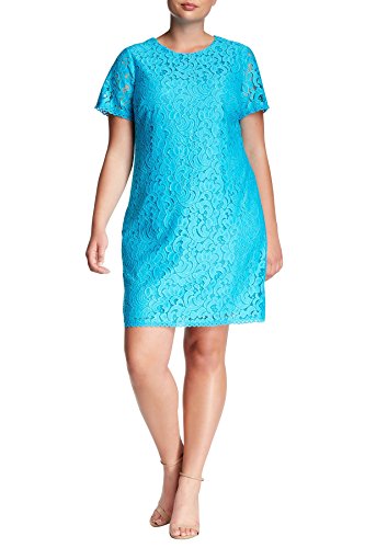 London Times plus size lace dresses are simply beautiful. we have a wide range of plus size trendy dresses. Effortless fashion is offered in this lace shift dress by London Times. This short sleeved lovely lace party dress features a crew neckline. The full figured blue colored dress has a shift style, which makes it look trendy and stylish and perfect for full figured women. The plus size party dress features a hidden back zipper, which helps you to slip into the dress with ease and comfort. The cocktail dress is made from nylon and is approximately 40 inches in length as measured from size 14W. So, buy this chic dress today and elevate your party wardrobe!Feature