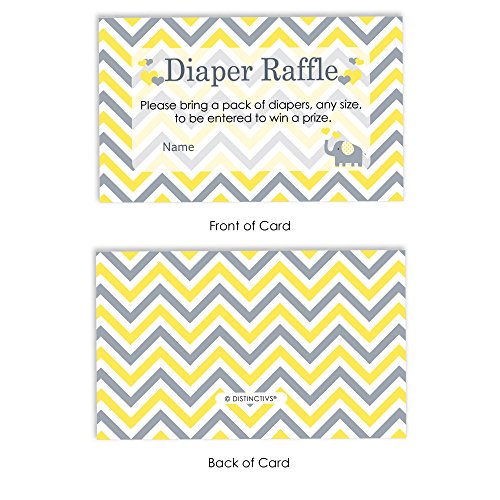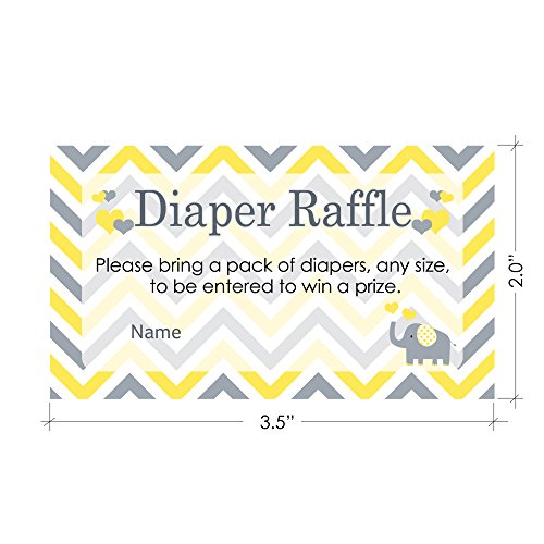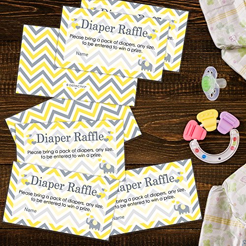 Studio : DISTINCTIVS Publisher : DISTINCTIVS Binding : Health and Beauty Product Description Order includes 25 Yellow Elephant Baby Shower Diaper Raffle Tickets. Tickets are each 3.5" x 2" to easily fit in envelopes with baby shower invitations. Diaper raffle tickets set up an easy baby shower game that stocks up the baby nursery. Professionally printed on premium high gloss cardstock. Diapers, envelopes, and any props pictured are not included with your order. 0