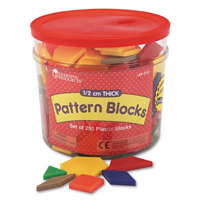 -. Binding : Toy -. Brand : Learning Resources -. Feature : Set of 250 plastic pattern blocks in six shapes and six colors. / Set of 250 plastic blocks in six shapes and six colors. / Blocks are 1/2 cm thick. / Teaching guide and storage bucket included. -. Label : LEARNING RESOURCES -. Manufacturer : LEARNING RESOURCES -. MPN : B001TQCGL0 -. PackageQuantity : 1 -. PartNumber : B001TQCGL0 -. ProductGroup : Toy -. ProductTypeName : TOYS_AND_GAMES -. Publisher : LEARNING RESOURCES -. Studio : LEARNING RESOURCES -. Title : o Learning Resources o - Pattern Blocks, For Grades Pre-K-8