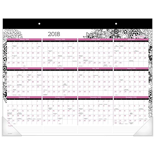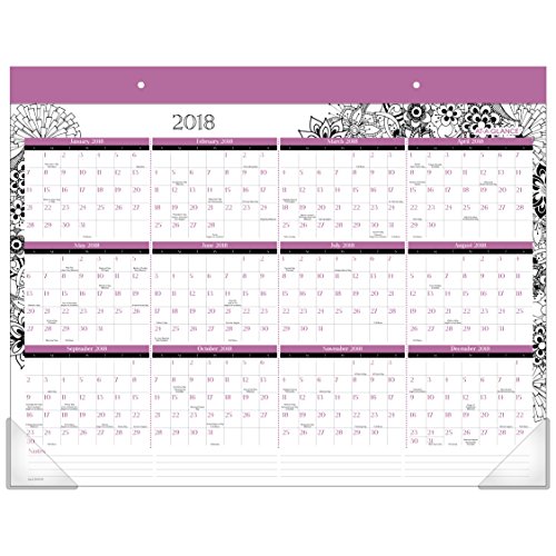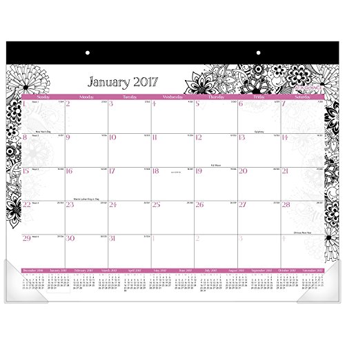 -. Feature : Monthly desk pad with FloraDoodle design displays a white calendar grid over a black background, with white flowers that have hand-drawn appeal; available in Pink or Black - color selected for you may vary / One month per page layout features unruled daily blocks for each day to keep track of important dates and upcoming events; weeks run Sunday - Saturday and holidays are marked for convenience / Calendar covers 12 months from January - December with Julian dates; full year calendar reference across the bottom of each monthly calendar page makes it easy to quickly check a date while making plans