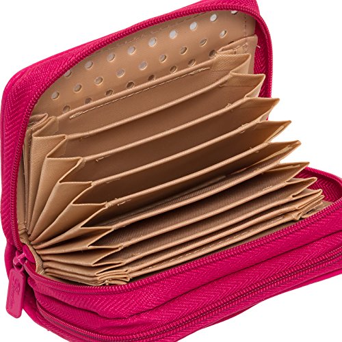 This Double Zip RFID Wallet by Buxton is a stylish and trendy way to stay organized on-the-go. This animal friendly faux leather wallet features two zip around compartments for extra secure storage. This adorable and compact wallet features RFID blocking technology to guard your credit cards from identity thieves with external scanning devices, or electronic pickpocketing. The first compartment includes 3 divided pockets where you can store anything from cash to gift cards. The additional gusseted compartment has 12 accordion style card slots to help keep your belongings organized. The exterior of the wallet features a clear finger glide ID window. Measures 3.5" x 4.5" x 1Feature