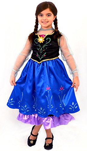 -. Binding : Apparel -. Brand : Disguise -. Color : Purple -. Department : girls -. Feature : Includes Dress, petticoat and vest. / Do not includes shoes and tights / Available in Toddler size (3T-4T) and Child sizes Small (4-6x) and Medium (7-8) -. ProductGroup : Apparel -. ProductTypeName : DRESS -. Title : Disney Frozen Anna Toddler/kids Costume deluxe