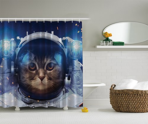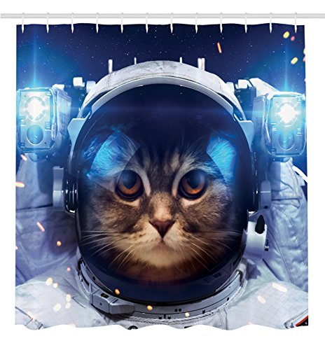 Cat Decorations Shower Curtain by Ambesonne, Astronomy Gifts Astronaut Cat in Space Graphic Galaxy Cosmos Art Prints for Kids Cute Kitten Design Decor Fabric Machine Washable Navy Gray Brown