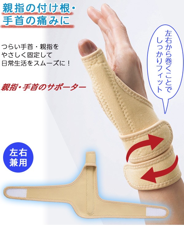 | 親指の付け根・手首のつらい痛みに!装着したまま作業ができるので、家事や育児・仕事で手を使う方に最適。薄手のため上からゴム手袋もはめられ、水仕事もラクラクです。親指をやさしく固定するプレート内蔵で、毎日働くアナタの手をしっかりサポート!2ヶ所の面ファスナーで、痛み具合に合わせて巻き方を調節でき、左右から巻くことでしっかりフィットします。目立ちにくいスキンカラー。着脱簡単/親指/手首/左右兼用/サポーター |
