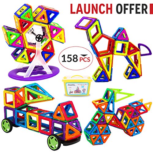 -. Feature : [ SAFETY AND QUALITY FIRST - A PROMISE WE NEVER BREAK ] : Safe to DIY for child with smooth hand-feeling, harmless to humans and environment, round edge geometrical shape in accordance with ASTM INTERNATIONAL STANDARDS / CPC & CPSC Safety Quality Certified . The magnetic block toys use high quality original ABS material, all rainbow dual color pieces have been through ultrasonic process for better sturdiness and improved durability. / [ LEARNING & EDUCATIONAL DEVELOPMENT SKILLS ] : Helps improve Pattern recognition and space imagination, the novel shapes they could build will enhance creativity and improve fine motor skills and Hand-eye coordination. / [ FEATURES ] : Total 158 Pcs includes (MORE SHAPES ) 40*Triangular , 36*Squares , 2* Hexagon, 8*Long Triangle , 6* Pentagon, 6* Diamonds, 4* Sector, 4*Trapezoid, 2* Wheels , 8*Fairy Wheels includes all , 42*Alphanumeric cards Fits into Square blocks, 1* Quality Storage box, 1* Instruction Booklet to build different shapes ( 2D to 3D ) / [ PARENT BOON - Easy Clean up ]: Super easy to clean them up since magnet sticks together and one wipe of area will just join them all together. Have your kids occupied for hours with building activity as oppose to gluing to iPad. We understood your needs and providing with a storage box as well / [ HAZZEL FREE - Customer Service ]: Since we have newly launched, try our product. Give us a chance, we are 100% sure you will be happy with our product quality/strength etc. Nothing to lose, we have a 30 days' return policy, we are ready to take it back and return your money, No questions asked.!!