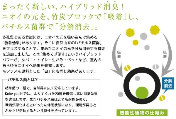 ニオイの元を吸着する竹炭(黒)・シラス(白)と、自然由来の「バチルス菌群」を使用したインテリアグリーン。タバコ・トイレ・生ごみ・ペットなどのあらゆるニオイを消臭します。和&モダンなデザインで、和洋問わずさまざまなシーンにマッチします。 |