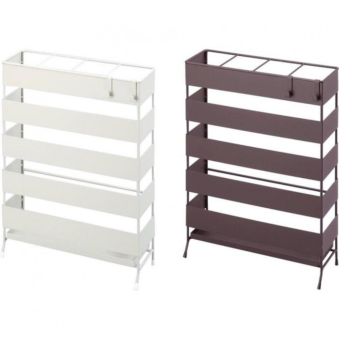 収納本数が少なくても立てやすい仕切り付きの傘立てです。フックが2個付属しているので、折りたたみ傘や靴べらも収納可能。水受けトレーは取り外し可能なので、お手入れも簡単です。 |