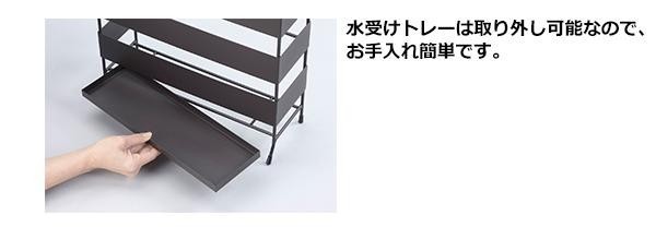 | 収納本数が少なくても立てやすい仕切り付きの傘立てです。フックが2個付属しているので、折りたたみ傘や靴べらも収納可能。水受けトレーは取り外し可能なので、お手入れも簡単です。 |