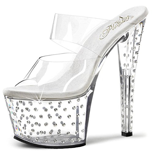 Product Description Featuring a pair of sparkly slide sandals. Rhinestones embellish the clear platform and heel. 0