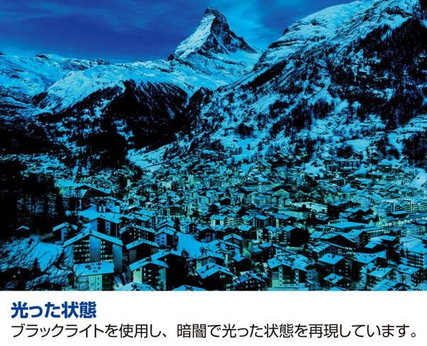 | ヨーロッパアルプスの名峰マッターホルンを望む谷あいの町(スイス)。美しい絵画のような情景をジグソーパズルでお楽しみください。蓄光塗料を用いているためパズルの絵柄に光をあてた後、暗い場所で蛍光を発します。 |