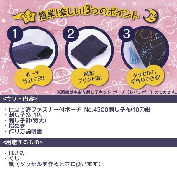 宇宙のモチーフをステッチして仕立てていくキットです。図案があらかじめ布にプリントされているので、簡単に本格的な刺し子がお楽しみ頂けます。 |