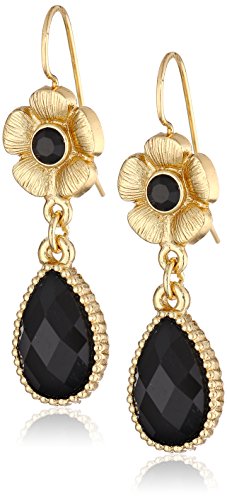 Featuring gold-toned flower posts with black crystal center stones Below are a set of pear-shaped, faceted black stones in gold-toned settings which complete this stylish design