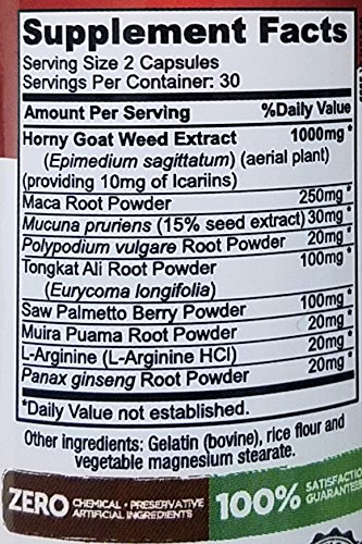 - Key Ingredients: 1000mg Epimedium Sagittatum (Horny Goat Weed, standardized to 10 mg Icariin per serving), Maca Root, Tognkat Ali root powder, Saw Palmetto Berry, Ginseng root powder.