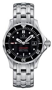 Stainless steel case with a stainless steel link bracelet. Unidirectional black ion-plated bezel. Black dial with luminous hands and dots hour markers. Minute markers around the outer rim. Date displays at the 3 o'clock position. Quartz movement. Scratch resistant anti- reflective sapphire crystal. Screw in crown. Case diameter: 28 mm. Case thickness: 10 mm. fold over clasp with push button. Water resistant at 300 meters / 1000 feet. Omega James Bond Seamaster 300M Quartz Ladies Watch 212.30.28.61.01.001.