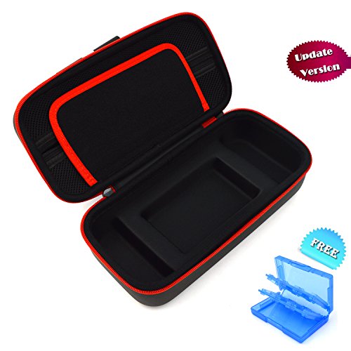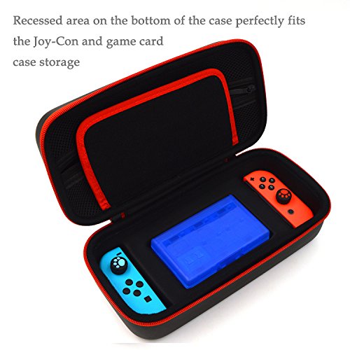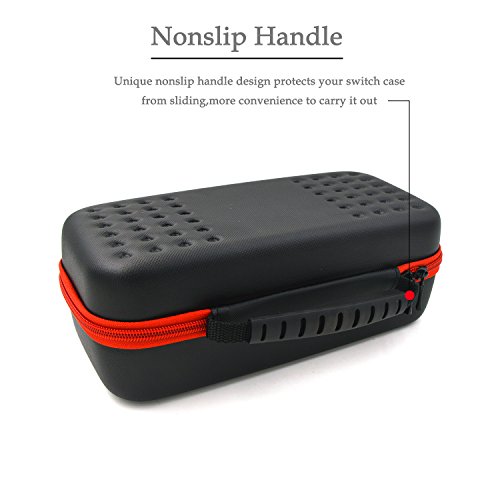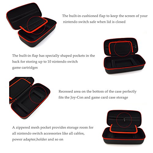 -. Feature : [Large Storage: ]Nintendo Switch Case Fits for Nintendo Switch Game console with the joy cons, joy con grip, an AC adapter, some USB cables, 10 game cards for the travel case, 22 game cards and 2 micro SD cards for the game card case. / [Durable and Strong: ]The outer shell of the case is anti-scratch and waterproof, more sturdy padding is added to the entire case to scatter the pressure so it will not be deformed, Inside there is cut out on the bottom designed for the Nintendo Switch console and a game card case, they will fit snugly so there will not squeeze or clash such as press down on the buttons or hit the screen while traveling. / [More Protective Details:] Double zippers are strong and won't get stuck or fall off. Handle on the top is made to be non-slip to prevent sliding from a sweaty hand. What's more an additional padding with ten elastic pockets can also protect the screen of game console at the same time. The mesh pocket for AC adapter is thickened with foam so the cable won't break or stab out of the mesh pocket. / [No Smell and Easy to Clean: ]The material is fine processed to relieve the smell so no bad odor escapes when you open the case. And simply clean and wipe with a wet cloth for its shell. / [Game Card Case: ]A transparent blue game card case can hold 22 game cards and 2 micro SD cards will come along with the travel case which is specially made for the travel case can be used as a built in component or a separate storage accessory.