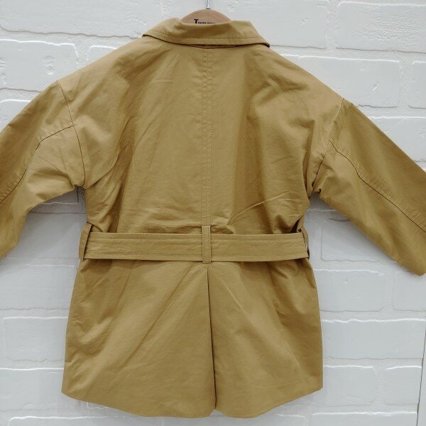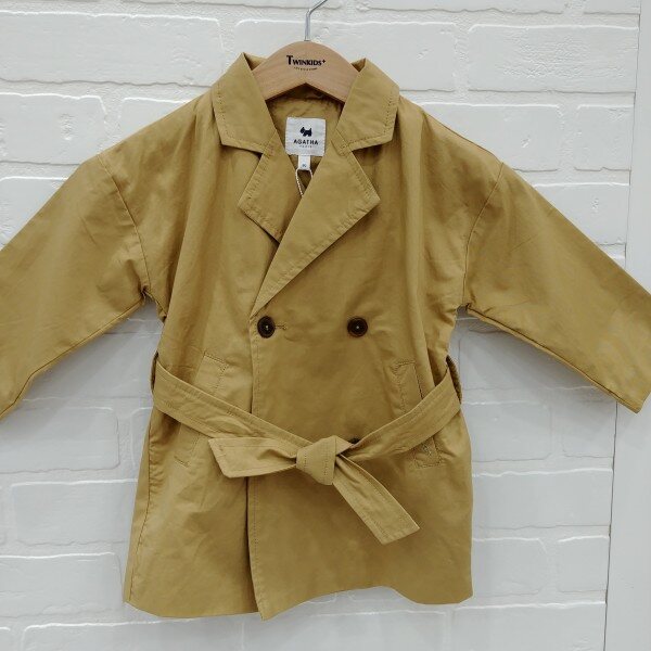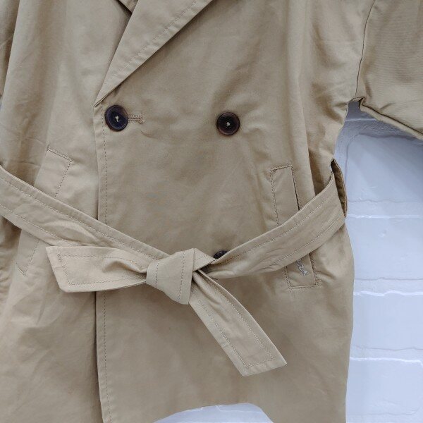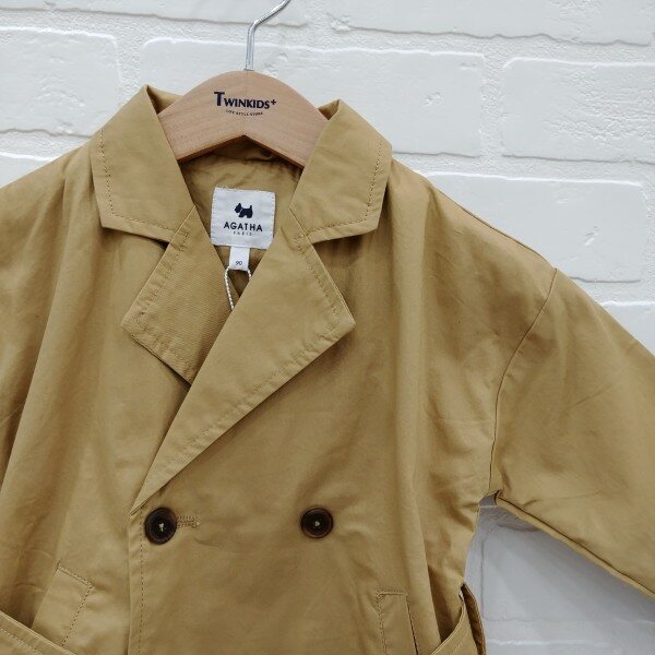 박시핏의 더블단추로 포인트를 준 공용 트렌치 코트, 허리끈과 포켓 로고자수가 포인트로 들어간 스타일.