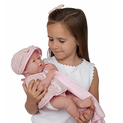 The La Newborn collection of real life baby dolls introduces its newest addition. Dressed in a beautiful pink knit set, our La Newborn is as sweet as can be. This precious baby doll features a new delightful expression and striking grey-blue eyes that are sure to melt your heart! she is a 15" all-vinyl anatomically correct "real girl" with movable arms, legs and head. She is made completely out of vinyl for easy care. This sweet little girl is all dolled up in a cute pink dress, matching chic hat and booties. This amazing set also includes a knit blanket so your child can swaddle her to keep her cozy and safe. JC Toys is one of the leading online sources for lifelike baby doll girls and accessories, and you're going to love the incredible value that we offer for this adorable Newborn baby doll!.Feature