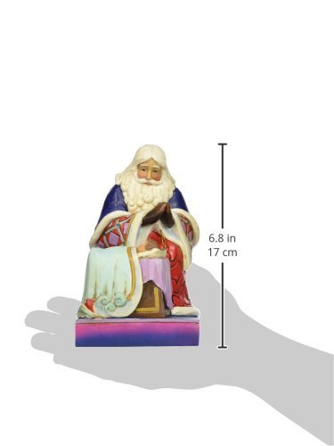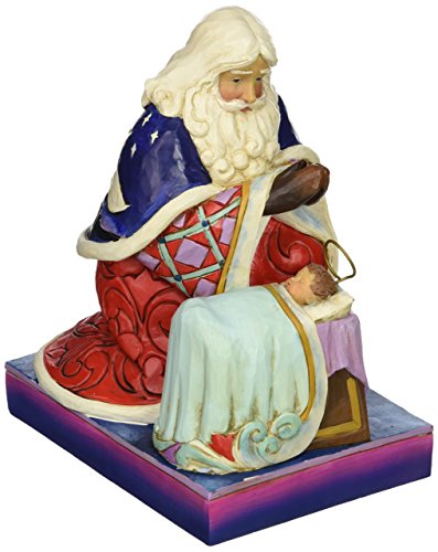 Jim Shores depictions of Santa worshipping the Baby Jesus are some of his most heartfelt and inspirational creations. This endearing piece with colorful accents in Bethlehem blue features a beautiful folkart inspired scene of the Heavenly Host.Feature